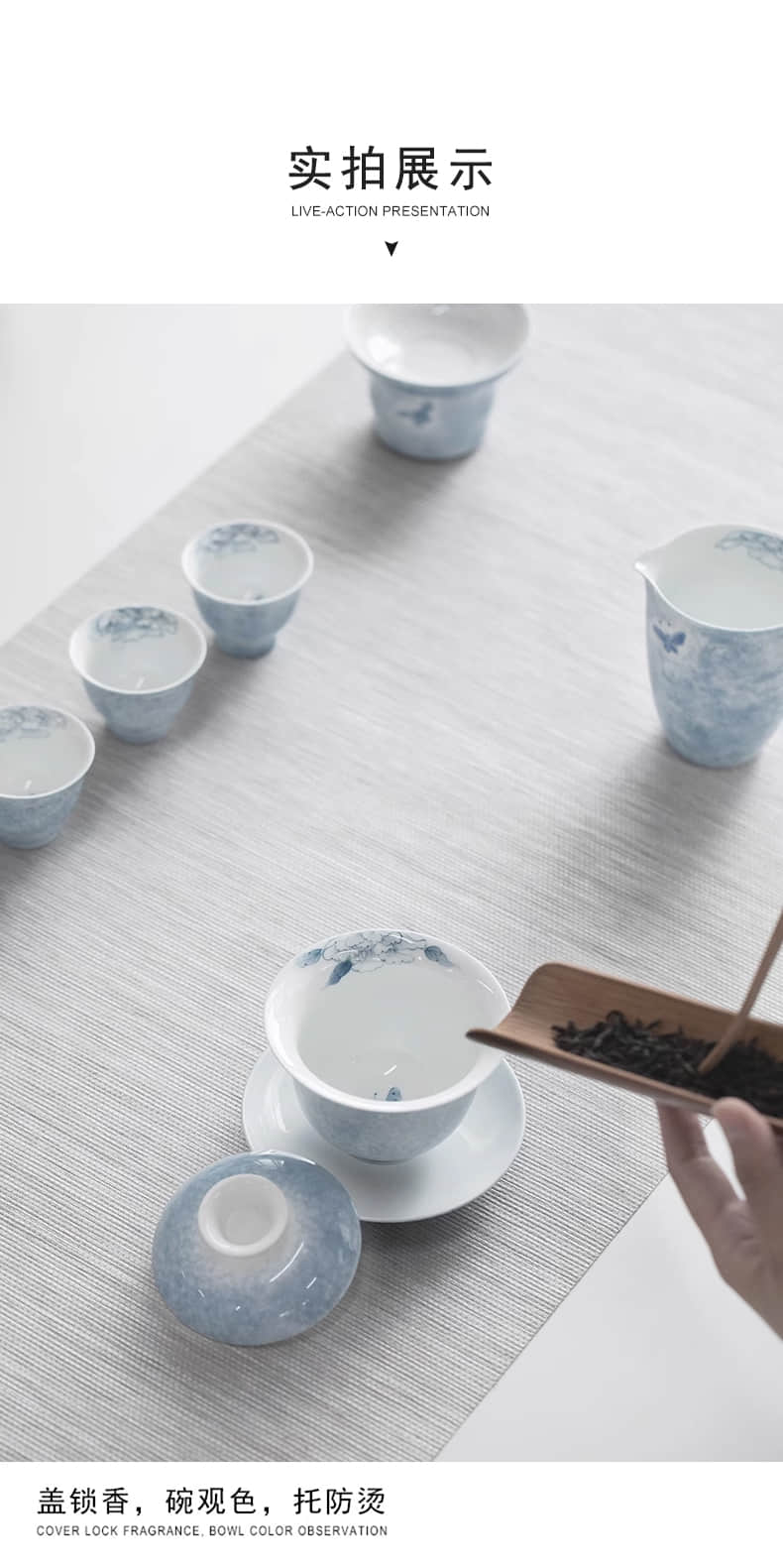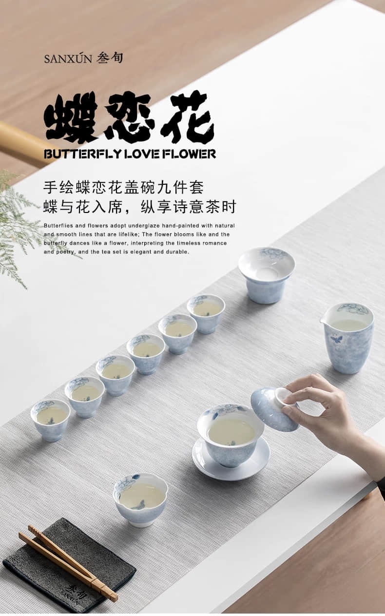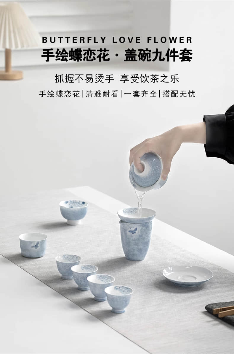 叁旬手绘蝶恋花功夫茶具套装家用盖碗陶瓷泡茶轻奢高档茶艺礼盒装