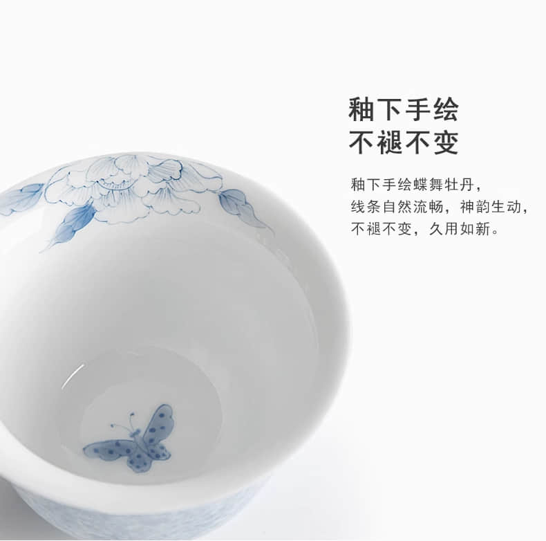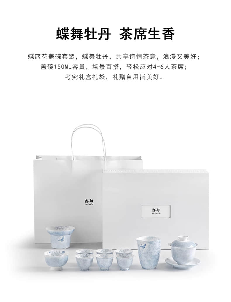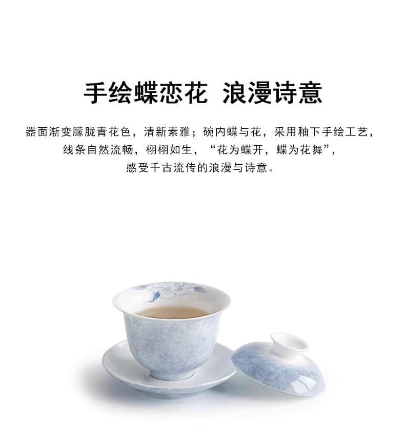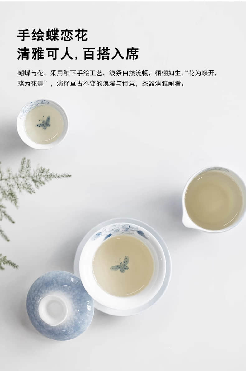 叁旬手绘蝶恋花功夫茶具套装家用盖碗陶瓷泡茶轻奢高档茶艺礼盒装