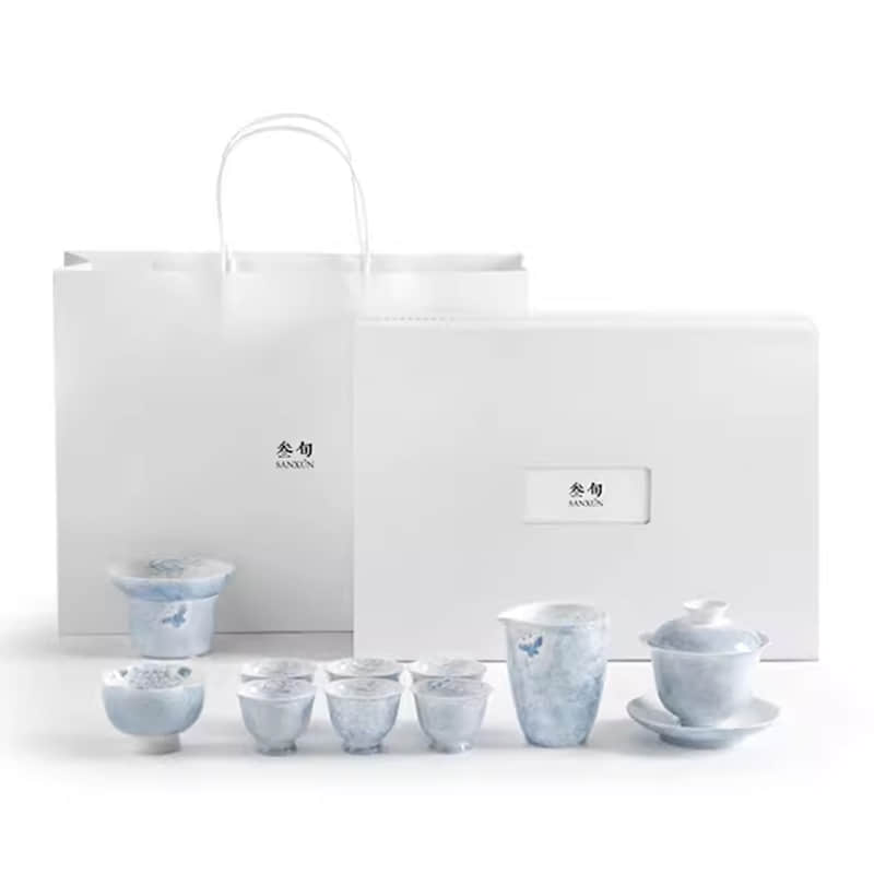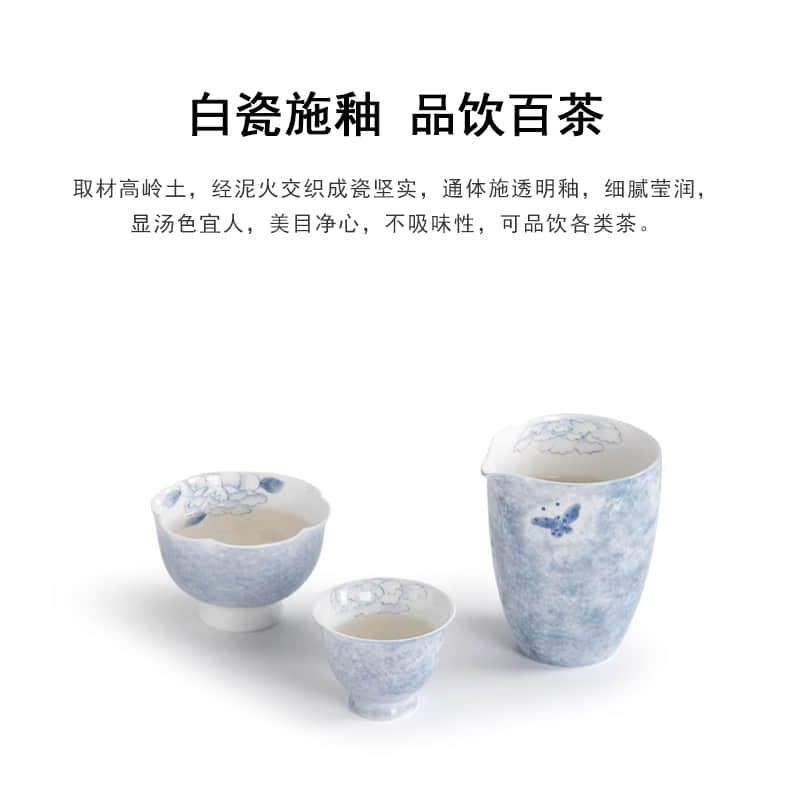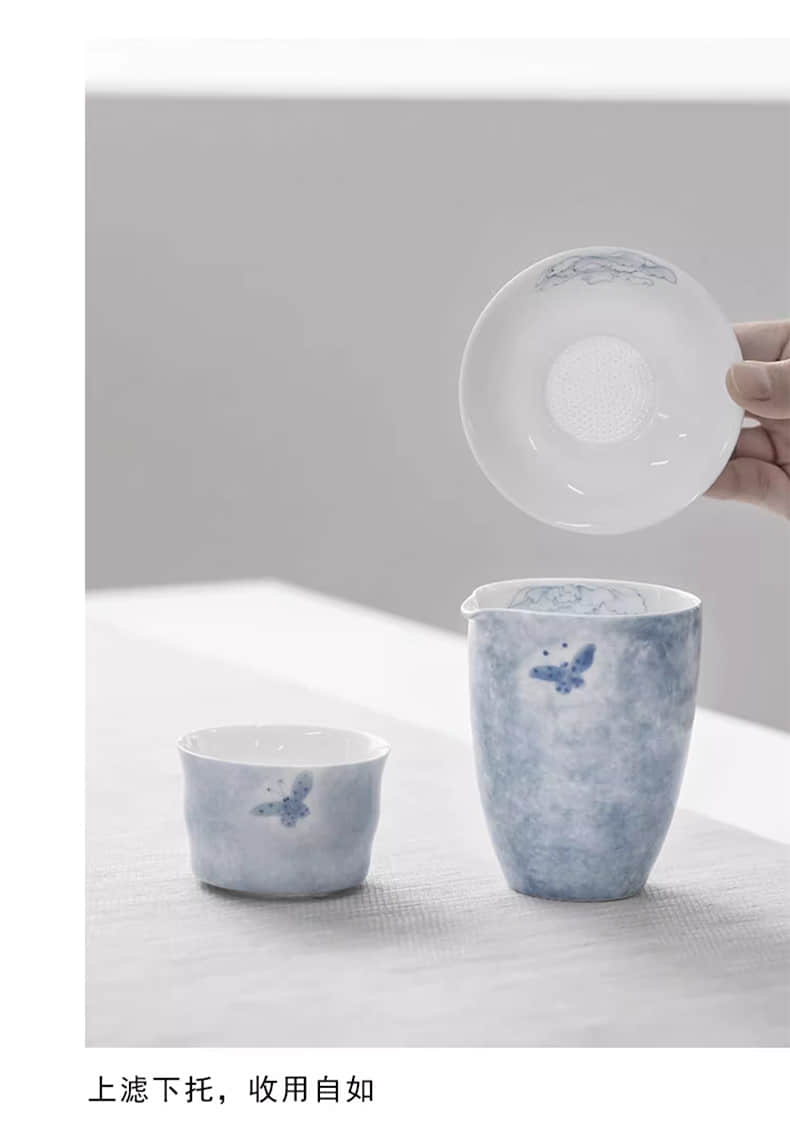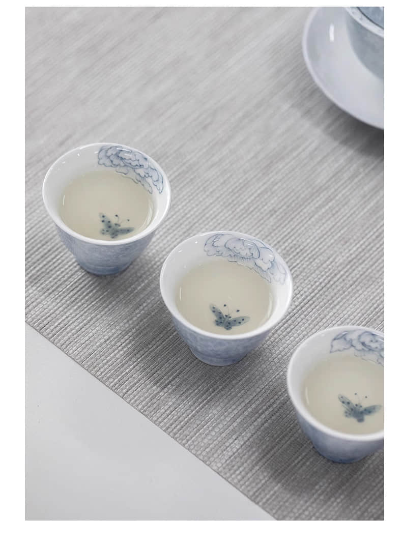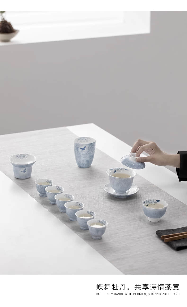 叁旬手绘蝶恋花功夫茶具套装家用盖碗陶瓷泡茶轻奢高档茶艺礼盒装